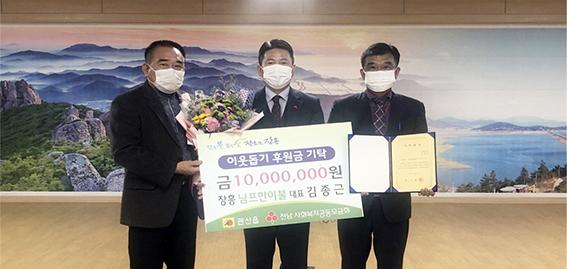 장흥군 님프만이블 김종근 대표는 3일 어려운 이웃을 위해 써달라고 후원금 1000만원을 관산읍에 기탁했다.