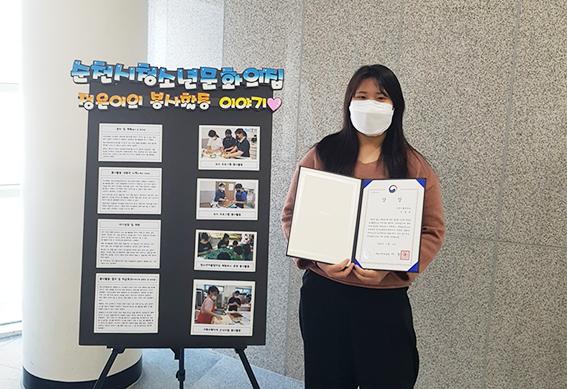 순천시 청소년문화의집 이정은(신흥중, 3학년)학생이 2020년 전라남도 청소년자원봉사대회 자원봉사 활동사례 부분에서 여성가족부장관상을 수상했다.