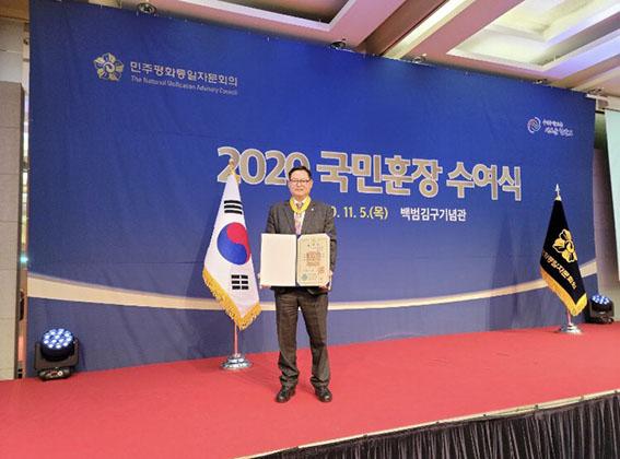 박옥천 회장은 “2020년 평화번영의 한반도 기반조성 유공 자문위원으로 선정돼 이처럼 큰 훈장을 받아 영광이고, 앞으로 다양한 통일의견 수렴과 공감대 형성에 더욱 매진하겠다.”고 말했다.