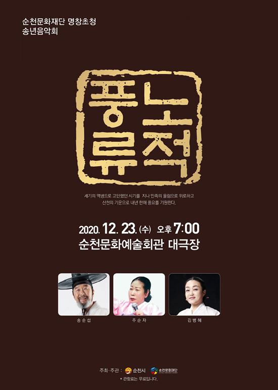 순천문화재단은 코로나19로 지친 지역민들을 위로하는 ‘순천문화재단 명창초청 송년음악회’를 23일 저녁 7시 순천문화예술회관 대극장에서 개최한다.