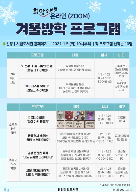 광양희망도서관이 방학을 맞아 어린이들을 대상으로 오는 18일~28일 2주간 겨울방학 교육프로그램을 운영한다고 밝혔다.