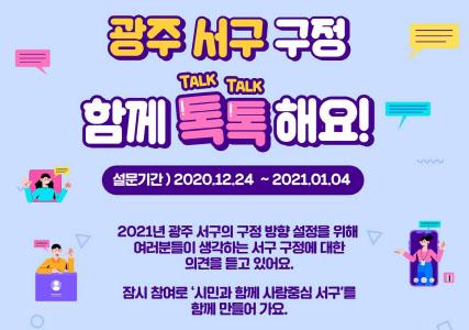 한편 서구청은 서구청 온라인 플랫폼인 ‘서구 톡톡’을 이용해 상시 설문조사를 실시, 시민들의 여론을 수렴해 구정에 적극 반영할 계획이다.