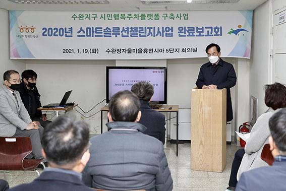 광산구가 19일 수완동 플랫폼 시범단지인 장자울아름마을5단지아파트에서 4차산업혁명 기술을 도시에 도입해 주차난을 해소하는 ‘2020년 스마트솔루션챌린지사업 완료보고회’를 개최했다.