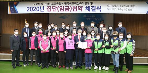 교육부와 17개 시·도교육청이 22일 경남도교육청에서 전국학교비정규직연대회의(학비연대)와 '2020 집단임금협약'을 체결했다.