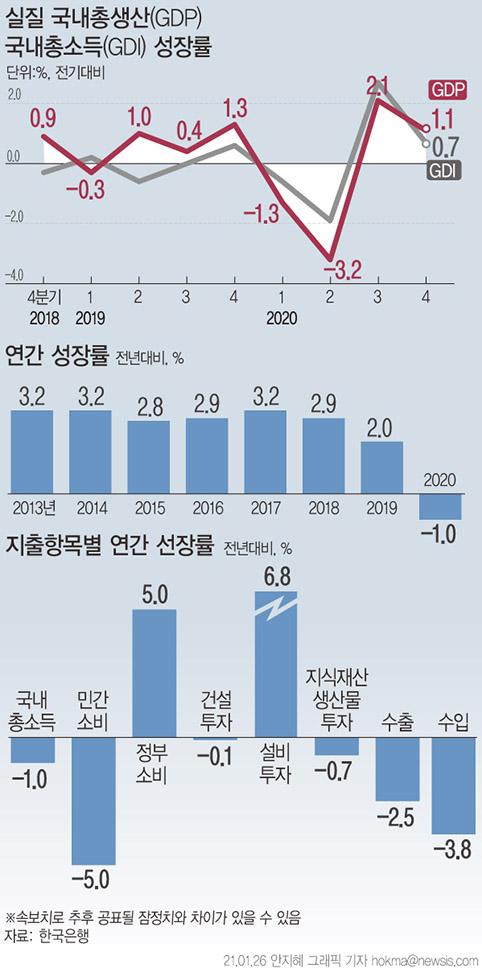 지난해 한국 경제가 1.0% 역성장했다. 신종 코로나바이러스 감염증(코로나19) 충격 속에서 외환위기 이후 처음으로 마이너스(-) 성장률을 기록했다.