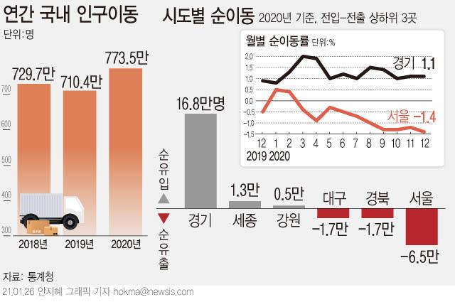 지난해 주택매매와 전·월세 거래 등이 크게 증가하면서 국내에서 이동한 인구수 증가 폭이 21년 만에 가장 컸던 것으로 나타났다. 서울을 떠나는 '탈서울' 흐름은 31년째 지속됐으며 수도권 인구 유입은 4년째 이어졌다.