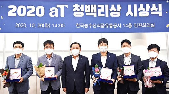 박석배 aT 상임감사(왼쪽 세 번째)가 2020년 aT 청백리상 시상식에서 수상자들과 기념 쵤영을 하고 있다. (사진=aT 제공) 2021.01.26.