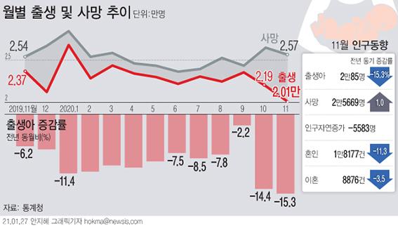출생아 수가 급격히 줄고 사망자 수는 늘면서 한 달 동안 5500명 넘는 인구가 자연 감소하는 등 역대 최대 감소폭을 기록하기도 했다.