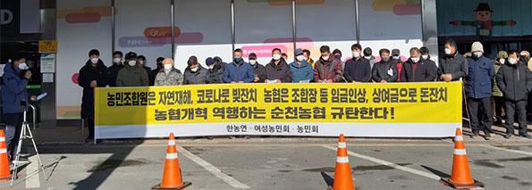 농민 조합원들은 지난달 29일 순천농협 본점 파머스마켓 앞에서 기자회견을 열고 “농민들은 자연재해로 농업소득이 30%이상 감소하고 코로나로 인해 농산물 소비가 안되 가격하락으로 이중고를 격으며 대출금으로 생계를 연명하는 현실인데도 순천농협은 조합장 연봉을 9520만원에서 1억1200만원으로 15%~17% 인상안을 기습적으로 상정했다”고 강력 비난하고 나섰다.