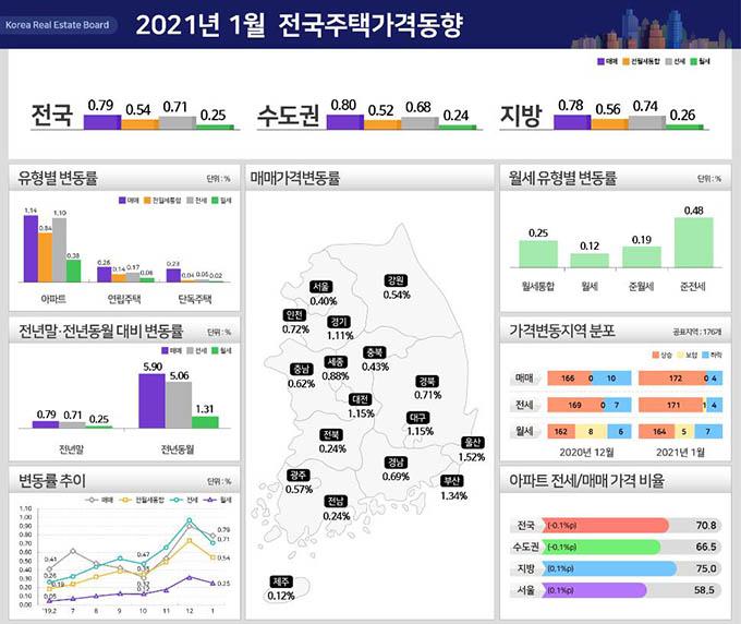한국부동산원이 1일 발표한 '전국주택가격동향조사'에 따르면, 올해 1월11일 기준 전국 월간 주택종합 매매가격은 0.79% 상승해 전월(0.90%) 0.11%포인트(p) 감소했으나 여전히 집값이 고공행진이다.