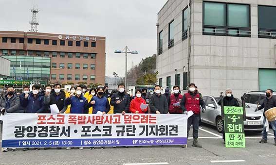 민주노총 광양시지부는 지난 5일 광양경찰서 앞에서 ‘포스코 폭발 사망사고 덮으려는 광양경찰서와 포스코를 규탄하는 기자회견’을 열어 이같이 촉구했다.