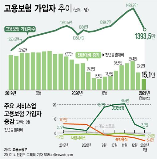 고용보험 가입자 증가폭은 2004년 2월 13만8000명 이래 최저 수준이다. 지난해 11월 3차 유행 억제를 위한 고강도 거리두기에 따라 증가폭이 크게 둔화했다.
