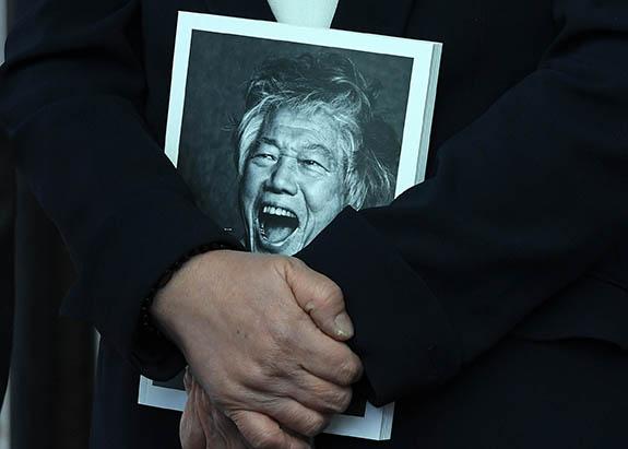 폐렴 증상으로 입원해 투병생활을 해오던 백기완 통일문제연구소장이 15일 별세했다. 이날 서울대병원 장례식장에 마련된 빈소에서 유가족인 장녀 백원담 교수가 기자회견을 하며 고인의 책자를 꼭 안고 있다. (공동취재사진) 2021.02.15.