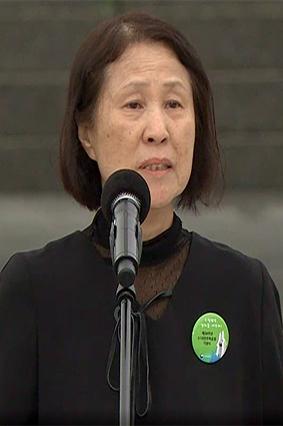 5·18민주화운동 당시 가두 방송을 통해 시민 참여를 독려하며, 항쟁을 이끌었던 전옥주(전춘심)씨가 지난 2018년 5·18 38주년 기념식에 참석, 자신의 사연을 이야기하고 있다. (사진=5·18민주화운동 38주년 기념식 영상 캡처)