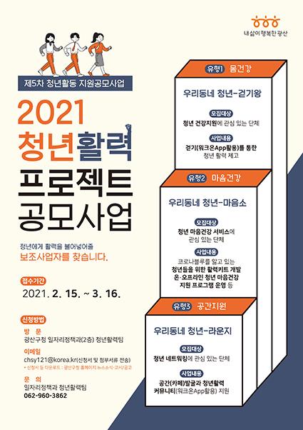 광산구(구청장 김삼호)가, 활력 넘치고 행복한 삶의 주체로 청년이 거듭날 수 있도록 지원하는, ‘2021 청년활력프로젝트 공모사업’ 참여 청년단체를 다음달 16일까지 모집한다.