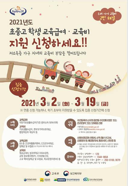 저소득층 가구 자녀의 교육비 부담 경감을 위해 지원하는 학생 교육급여 및 교육비는 매년 3월 새 학기에 신청을 받아 지급한다. 특히, 올해(2021학년도)는 부교재비와 학용품비를 교육활동지원비로 통합 지원하며, 지원 금액을 대폭 인상해 교육급여 보장 수준을 강화했다.