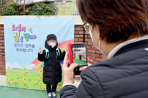 등교 첫날인 2일 광주 남구 주월동의 초등학교 앞에서 어머니가 자녀의 입학 기념 사진을 찍고 있다. 2021.03.02.