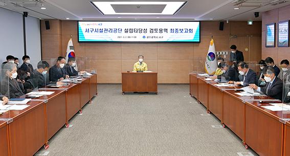 서구는 검증심의회 의원, 국장 및 해당 부서장이 참석한 가운데 광주시 서구 시설관리공단 설립타당성 검토용역 최종보고회 및 검증심의회를 개최하고 용역 결과에 대한 신뢰성을 확보했다.