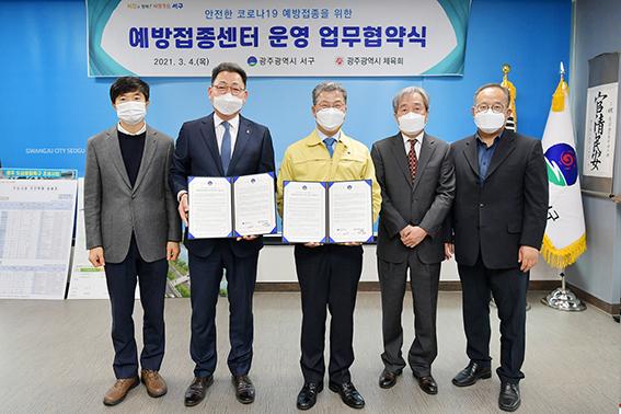서구(구청장 서대석)가 지난 4일 지역예방접종센터로 운영하게 될 염주종합체육관을 관리·운영하고 있는 시 체육회(체육회장 김창준)와 안전한 코로나 19 예방접종을 위한 예방접종센터 운영 업무 협약을 체결했다고 밝혔다.