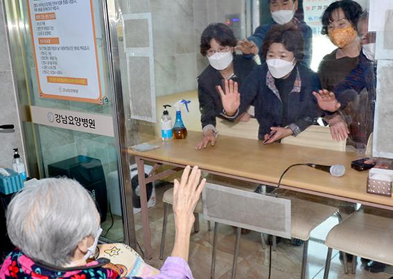 이에 정부는 환기가 잘 되는 별도 공간에서 '비접촉 면회'를 허용한다. 요양병원은 사회적 거리 두기 2단계 이하, 요양시설은 2.5단계 이하일 때 비접촉 면회가 가능하다.