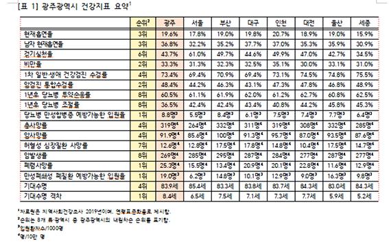 비만율의 경우 광주가 33.3%로 인천 35.1%에 이어 두 번째로 높았으며, 흡연율(19.6%)과 남자흡연율(36.8%)은 각각 세 번째를 기록했다.