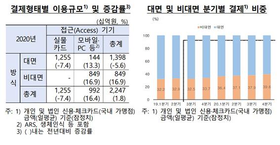 지난해 코로나19 여파로 실물카드 결제는 줄어든 반면 스마트폰 등 모바일과 PC를 통한 비대면 결제는 17% 급증한 것으로 나타났다.