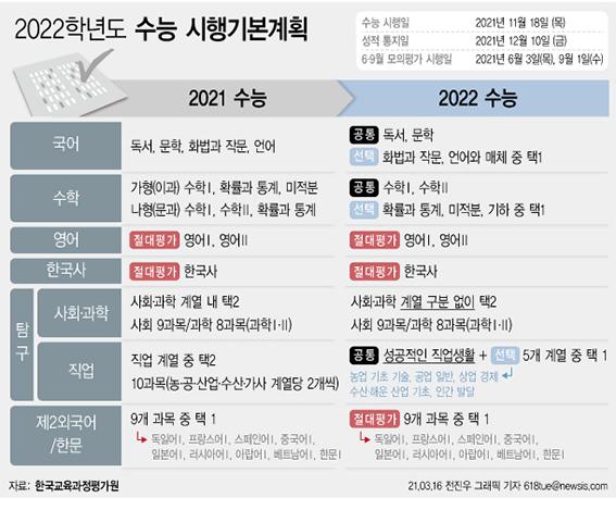 올해 수능은 코로나19 유행 크기와 관계 없이 오는 11월18일 치러질 예정이다. 코로나19 유행 1년차였던 지난해에는 수능이 2주간 연기돼 12월에 진행된 바 있다. 2022 수능 성적은 오는 12월10일 통지된다. 수시·정시 원서접수 등 다른 대입일정도 기존 계획대로 진행된다.