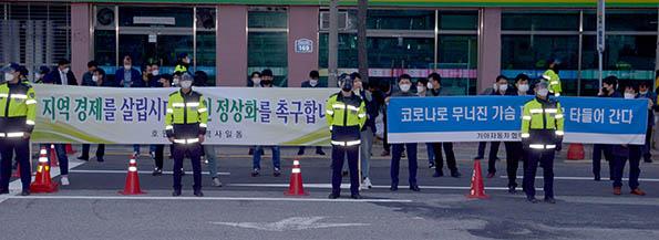 광주·전남 자동차부품 생산업체 임직원이 19일 오후 광주 광산구 하남산업단지 입구에서 전국금속노조 호원지회의 공장 설비 점거 농성 중단을 촉구하며 현수막 시위를 하고 있다. 2021.03.19.