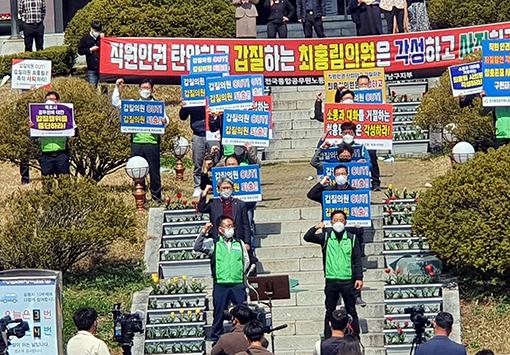 전국통합공무원노동조합 목포시지부가 23일 전남 목포시청 현관 앞 잔디광장 주변에서 시의회 최홍림 의원의 갑질 사과 등을 촉구하는 결의대회를 하고 있다. 2021.03.23.