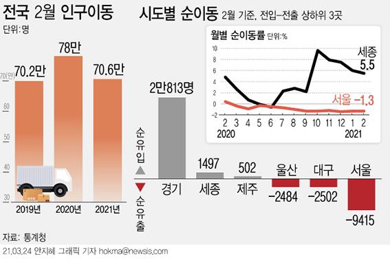 24일 통계청이 발표한 '2021년 2월 국내 인구이동' 자료에 따르면 지난달 이동자 수는 70만6000명으로 전년 동월 대비 9.6% 감소했다.
