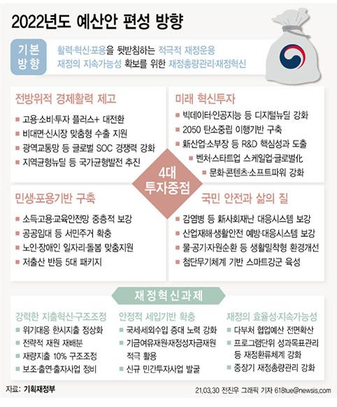 기획재정부는 30일 활력·혁신·포용을 뒷받침하는 '적극적 재정운용'과 재정의 지속가능성을 확보하기 위한 '재정총량 관리·재정혁신'을 골자로 한 '2022년도 예산안 편성 및 기금운용계획안 작성지침'이 국무회의에서 의결됐다고 밝혔다.