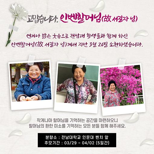 전남대 재학생과 졸업생들은 서 할머니의 뜻을 기리기 위해 이날부터 4월2일까지 인문대 벤치 앞에 작은 추모공간(분향소)을 운영한다.