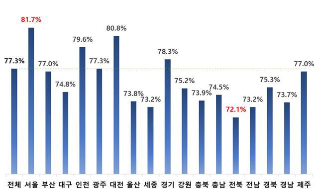 소재지별로 서울(81.7%) 대전(80.8%), 인천(79.6%), 경기(78.3%) 등 4개 시·도의 유지취업률이 평균보다 높았다. 서울을 비롯한 광역시 소재 학교의 유지취업률(79.3%)이 비광역시(75.7%)보다 3.6%포인트 높게 나타났다. 반대로 전북(72.1%)은 가장 낮은 유지취업률을 보였다.