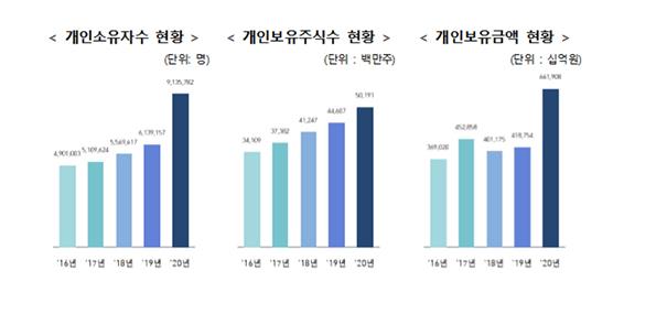 개인소유자는 지속적 증가추세를 보여왔으나 2019년 614만명에서 2020년 914만명으로 50%(300만명)가량 늘었으나 여전히 5000만원 미만의 소액 투자자가 대부분으로 집계됐다.