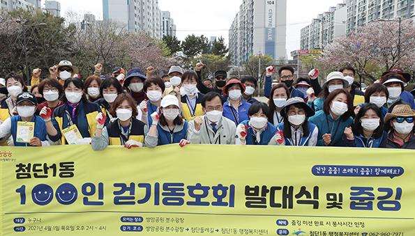 광주 광산구 첨단1동(동장 한현태)은 ‘첨단아미둘레길 100인 걷기동호회 발대식’을 1일 쌍암공원 분수광장에서 열었다. 발대식을 마친 후 동호회원들은 쌍암공원-둘레길-첨단1동 행정복지센터 구간을 걸으며 환경미화 활동도 같이 했다.