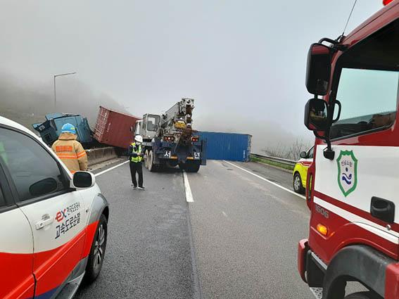 경찰과 도로공사 등에 따르면 이날 오전 6시 46분경 호남고속도로 서순천IC에서 승주IC 방향 7㎞지점의 내리막길을 달리던 컨테이너 트레일러가 전복되는 사고가 발생했다. 이에 순천소방서는 오전 7시 2분경 현장에 도착, 장비 5대와 16명을 투입해 현장정리를 했다.