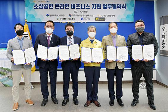 광주·전남지방중소벤처기업청(청장 장대교)는 지난 6일 광주 서구, 김대중컨벤션센터, 전남생산자협동조합, 셀러24, ㈜인필과 광주 서구지역 ‘소상공인의 온라인시장 진출 활성화’를 위한 업무협약을 체결했다고 밝혔다.
