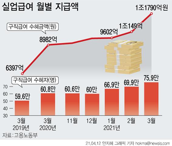 고용노동부가 12일 발표한 3월 노동시장 동향에 따르면 지난달 구직급여 지급액은 1조1790억원으로 지난해 같은 기간(8982억원) 대비 2808억원(31.2%) 증가했다.