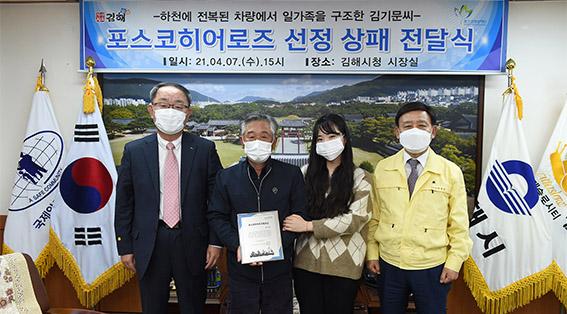포스코청암재단은 김해시 화목동 봉곡천에서 발생한 차량 하천 추락·전복사고 현장에서 장애를 가진 몸으로 구조활동을 펼쳐 일가족 3명의 소중한 인명을 구한 시민 김기문(57)씨를 히어로즈로 선정해 김해시청에서 상패와 자녀 장학금을 전달했다고 12일 밝혔다.