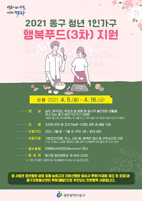 동구(청장 임택)는 코로나19 등 일상생활에 어려움을 겪고 있는 청년 1인 가구를 위한 ‘행복푸드’ 3차 지원에 나선다고 밝혔다.