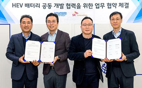 현대차·기아와 SK이노베이션이 공동으로 하이브리드카 배터리를 개발한다고 16일(금) 밝혔다. (왼쪽부터) 현대차·기아 전동화개발센터 최우석 상무, SK이노베이션 김유석 배터리마케팅본부장, 현대차·기아 파워트레인부품구매사업부 박찬영 상무, SK이노베이션 이장원 배터리연구원장. /현대차·기아 제공