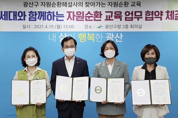광산구는 19일 오후 구청 2층 상황실에서 광주서부교육지원청, 광산구 어린이집연합회, 한국유치원총연합회 광산구분회와 ‘미래세대와 함께하는 자원순환 교육’ 업무협약을 체결했다.