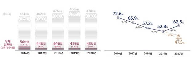 월평균 가구 총소득은 478만원으로 전년 486만원 대비 1.6% 감소한 수준이다. 금융자산도 6450만원으로 전년 6942만원 대비 7.1%나 줄어들었다.