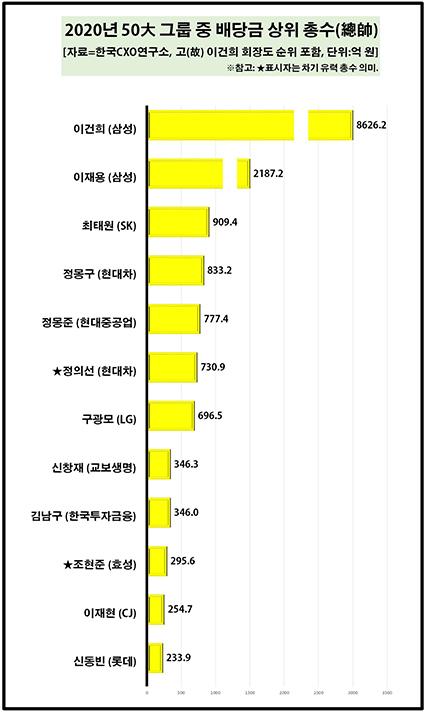 이 가운데 고 이건희 회장의 지분에 대한 배당금은 작년 한 해 8626억원(우선주 포함시 8644억원)으로 조사 대상자 중 가장 많았다. 50대 그룹 총수 전체 배당금의 48.2%나 차지하는 금액이다. 실제 이 배당금은 이 회장의 상속인들에게 돌아갔다. 2019년 때 이 회장이 받은 배당금 4738억원과 비교하면 1년 새 3887억원(82%↑)이나 증가했다.