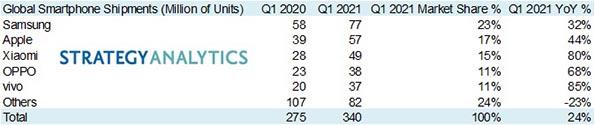 삼성전자와 애플에 이어서는 모두 중국 제조사가 시장 점유율 상위권에 올랐다. 샤오미(4900만대, 15%), 오포(3800만대, 11%), 비보(3700만대, 11%)가 3~5위를 차지했다. 3개 업체의 1분기 출하량은 모두 전년 동기 대비 60% 이상 성장했다.
