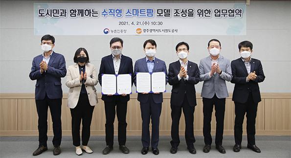 광주도시철도공사(사장 윤진보)와 농촌진흥청(청장 허태웅)은 21일 광주시 서구 공사 본사에서 ‘AI스마트팜 조성 협약식’을 체결하고 금남로4가역에 1089㎡ 규모의 인공지능을 활용한 수직형 스마트팜을 조성하기로 합의했다. 2021.04.21 (사진=광주도시철도 공사 제공)