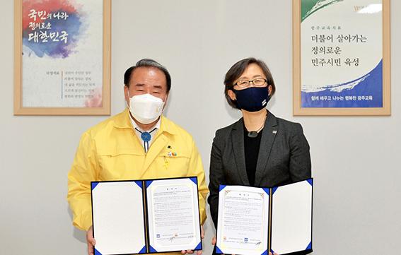 광주시교육청이 21일 교육감실에서 여성가족부 산하 한국양성평등교육진흥원과 교원 및 학교현장의 성인지력 제고와 성평등 의식 향상을 위한 업무협약(MOU)을 체결했다.