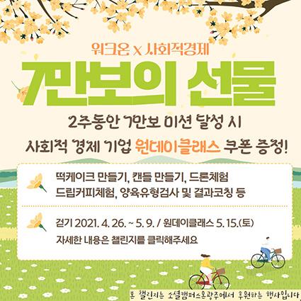 26일부터 5월9일까지 2주간 워크온 챌린지를 진행해 이 기간 중 7만보를 달성한 시민에게 동반 1인까지 가능한 사회적 경제 기업 ‘원데이 클래스’ 무료 쿠폰이 제공된다.