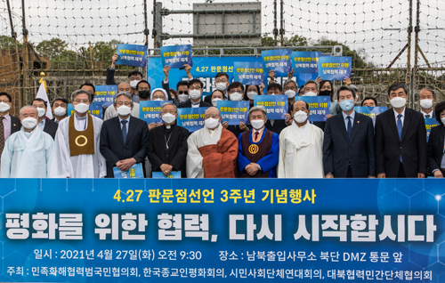 27일 오전 경기도 파주시 남북출입사무소 북단 DMZ 통문 앞에서 열린 4.27 판문점선언 3주년 기념행사가 끝난 뒤 참석자들이 기념촬영을 하고 있다.