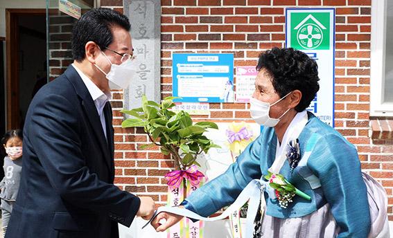 김 지사는 이어 박씨가 거주하는 석호마을 경로당을 찾아 마을 어르신과 담소를 나누며 함께 했다. 또한 코로나19 예방과 확산 방지를 위한 지역 어르신의 협조에도 감사를 표했다.